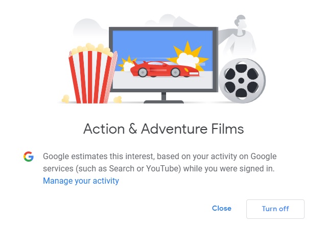 Note the toggle to turn ad personalization on or off. It is checked on by default. Note, also, that the interests at the bottom are based on usage of Google properties such as Google.com or YouTube, as well as “websites & apps that partner with Google to show ads.” Since GDN reaches 90 percent of the global internet audience, this bucket could include most websites and apps.